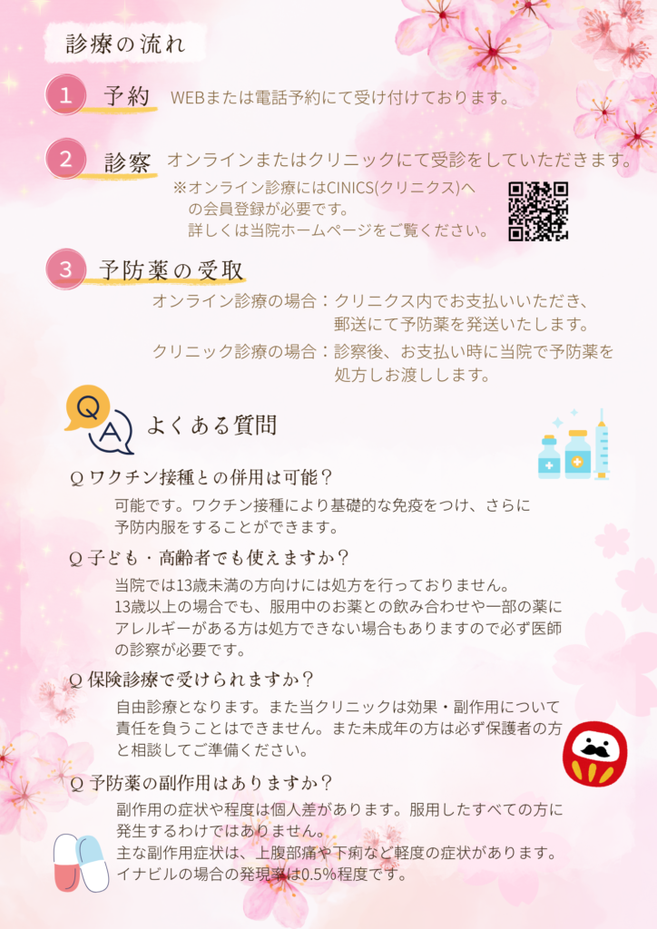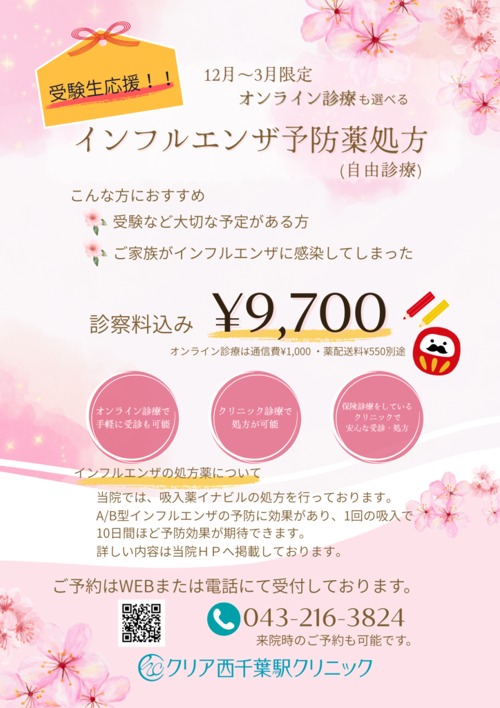 受験など大切な予定がある方、ご家族がインフルエンザに感染してしまった方などにおすすめです。対面、またはオンラインでの診察が可能となっているため、遠方にお住いの方でもご気軽に受診いただけます。